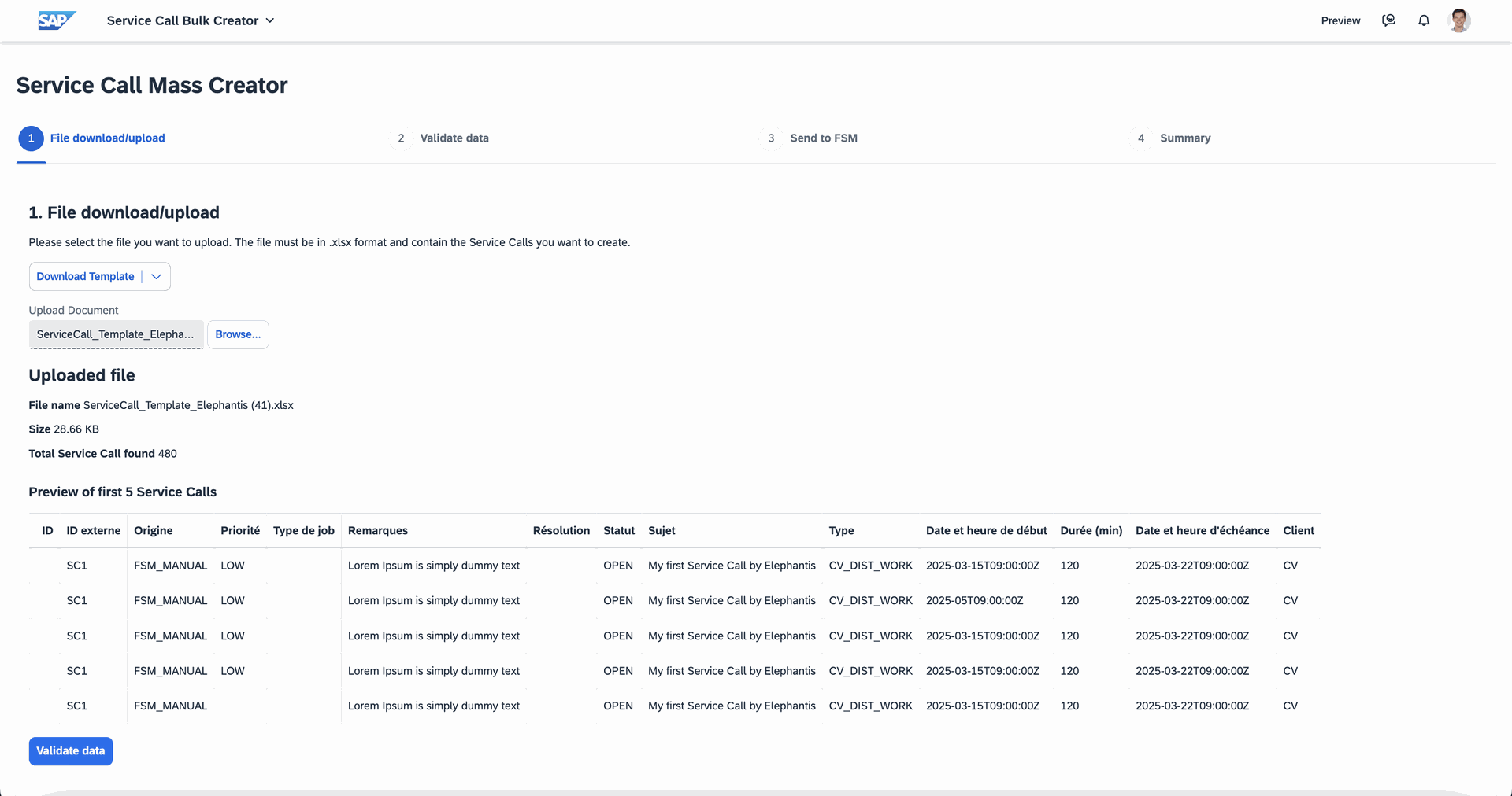 FSM Web StandaloneThis extension allows for the bulk creation of Service Calls in SAP FSM from an Excel file. With a clear and guided interface, you can validate, control, and create your data in just a few clicks.