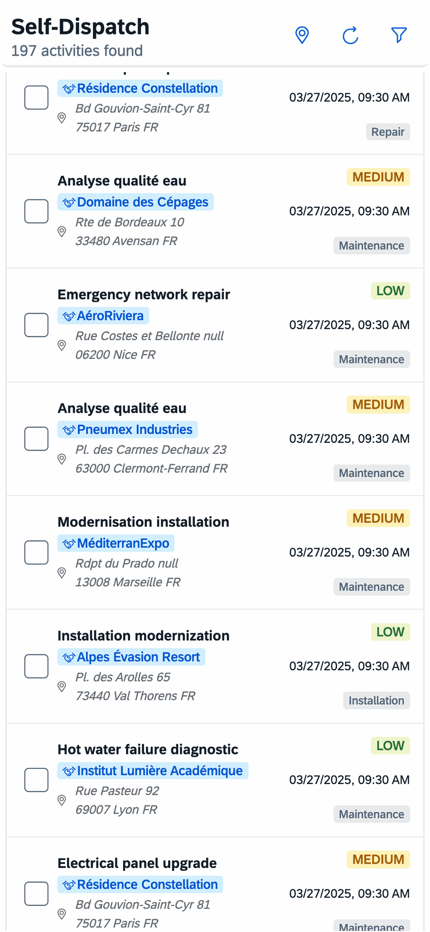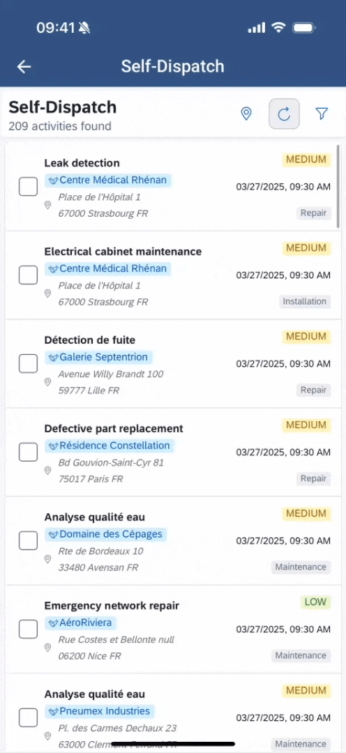 FSM MobileThis extension allows technicians to assign activities to themselves from their mobile devices. They can view the available interventions around them or based on defined criteria. The assignment is instantly synchronized.
